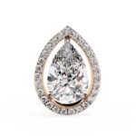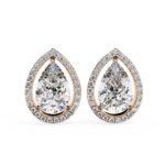 These are halo stud earrings featuring a pear cut center diamond The center stone is held in place by a prong setting and is surrounded by a halo of smaller, round brilliant cut stones. This halo enhances the size and brilliance of the center stone.