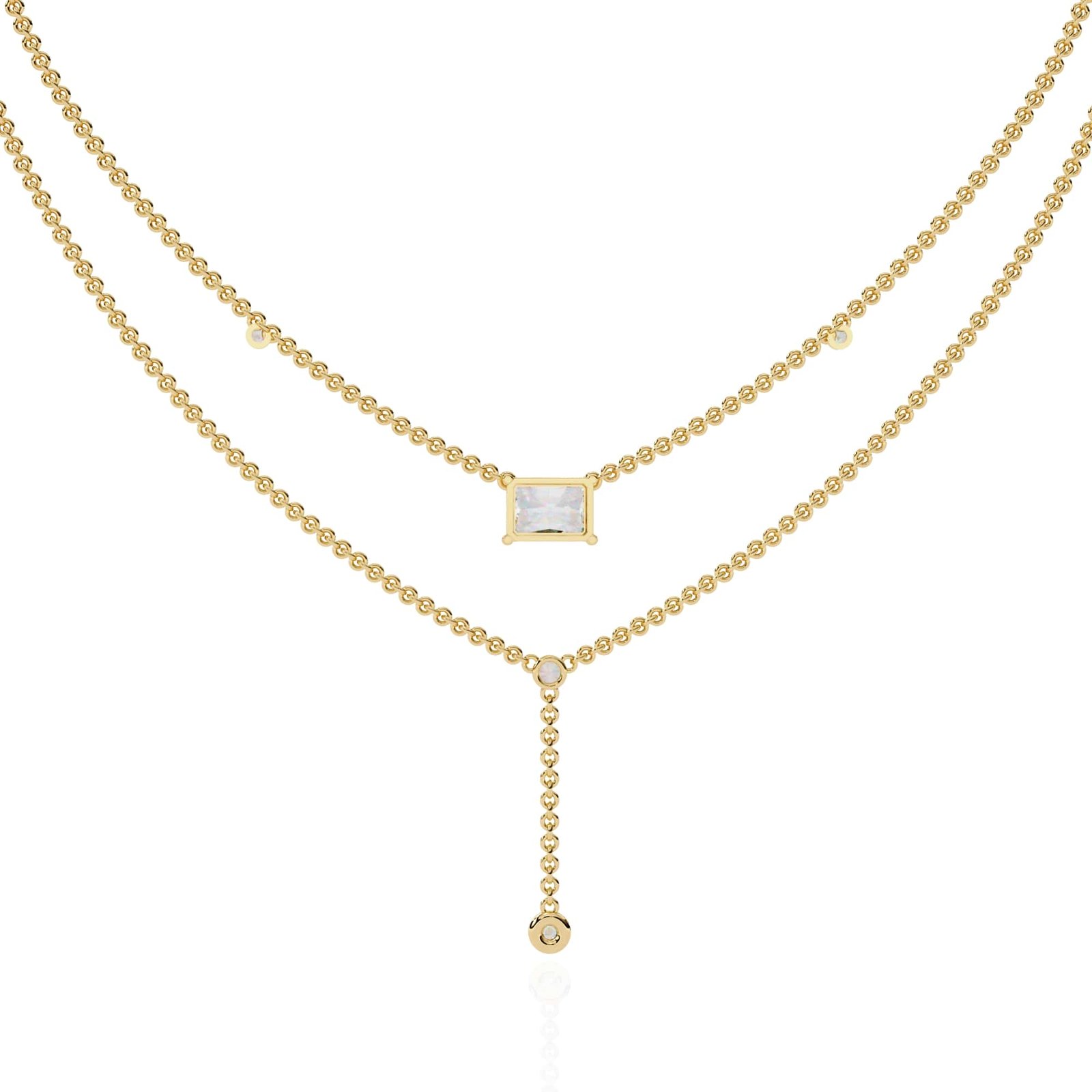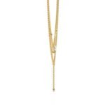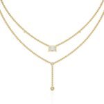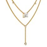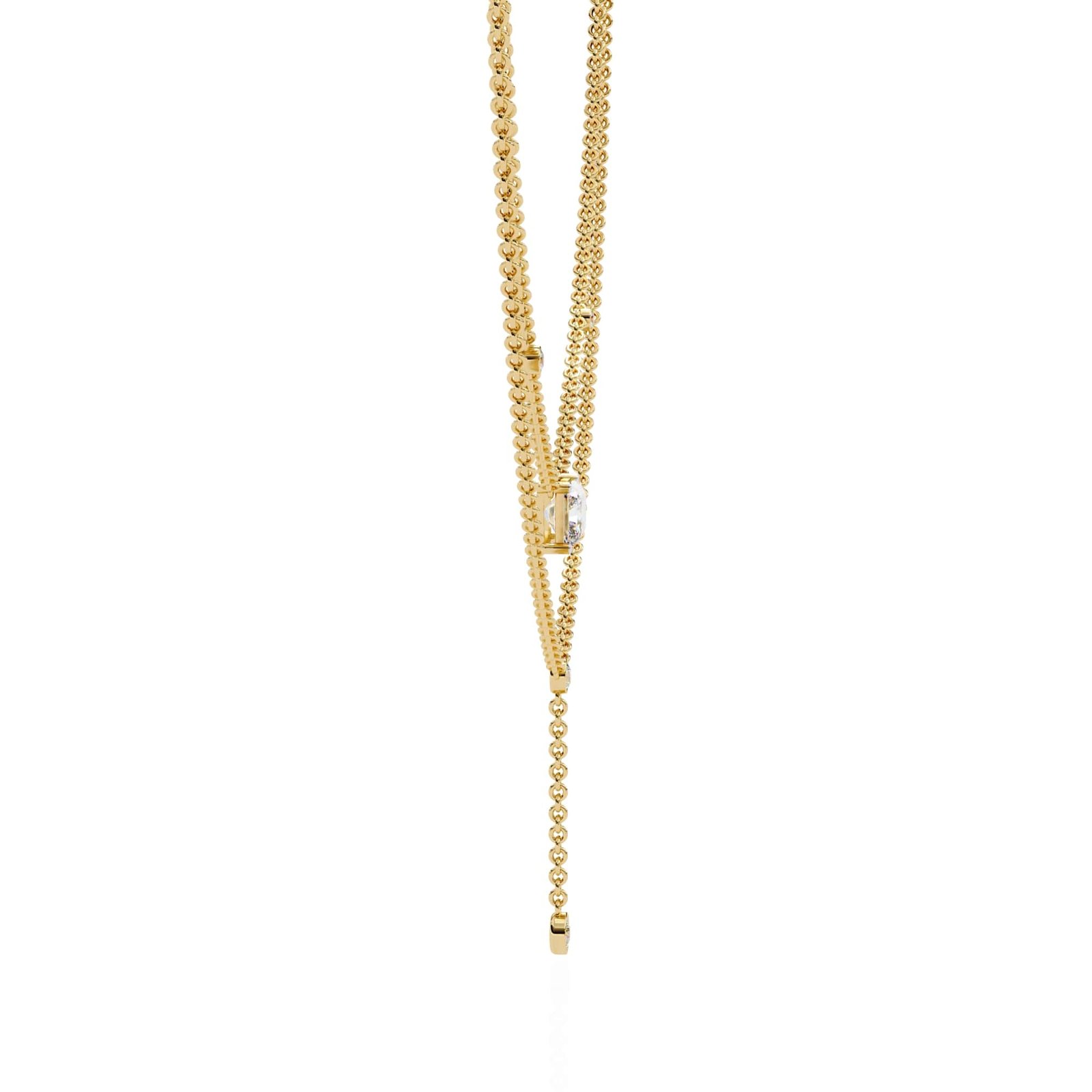 The upper layer consists of a delicate chain with small diamonds spaced evenly along its length.The lower layer mirrors the upper layer in style and size of diamonds, but also features a drop pendant with a larger diamond at the bottom. The pendant is attached to the chain by a short length of finer chain, creating the “Y” shape.