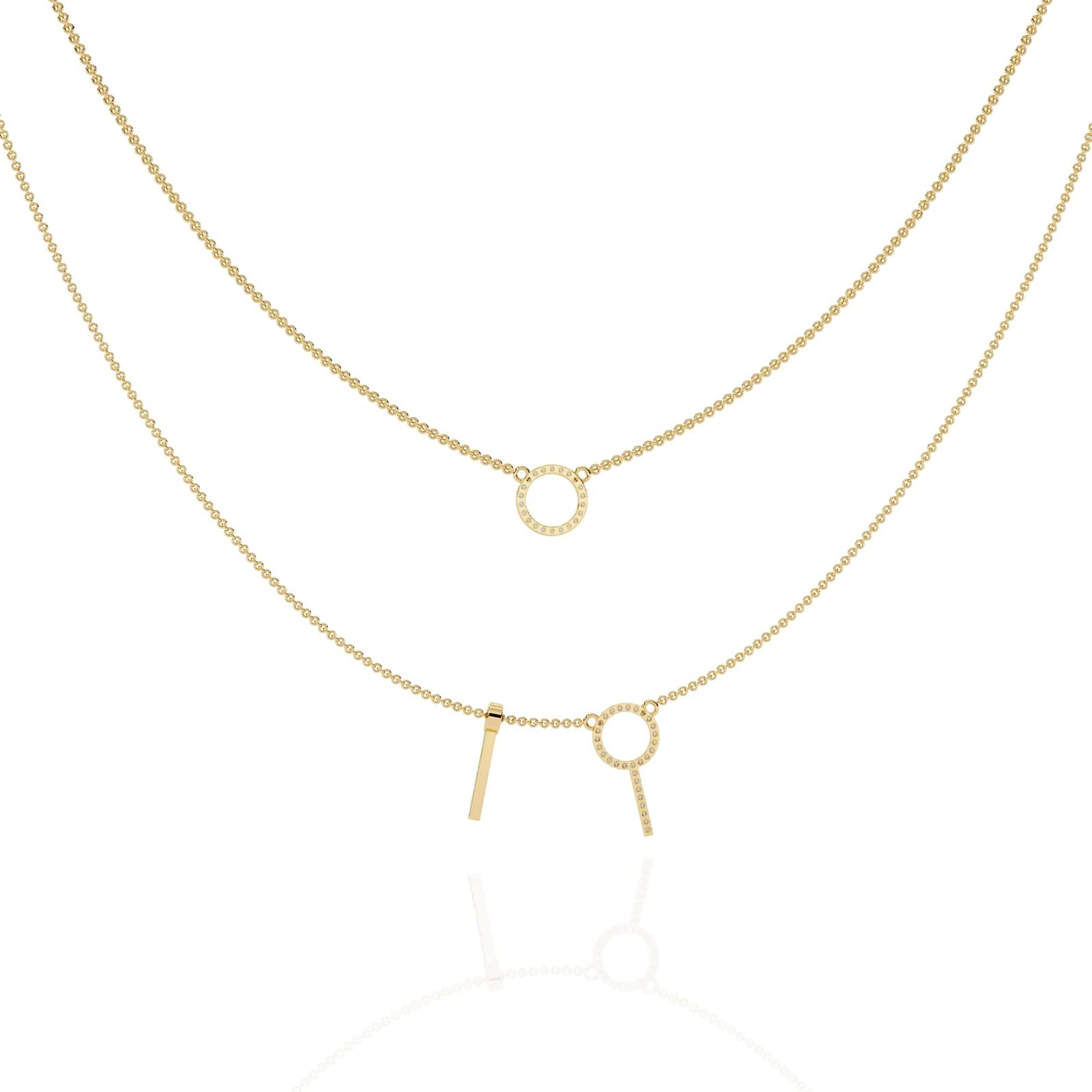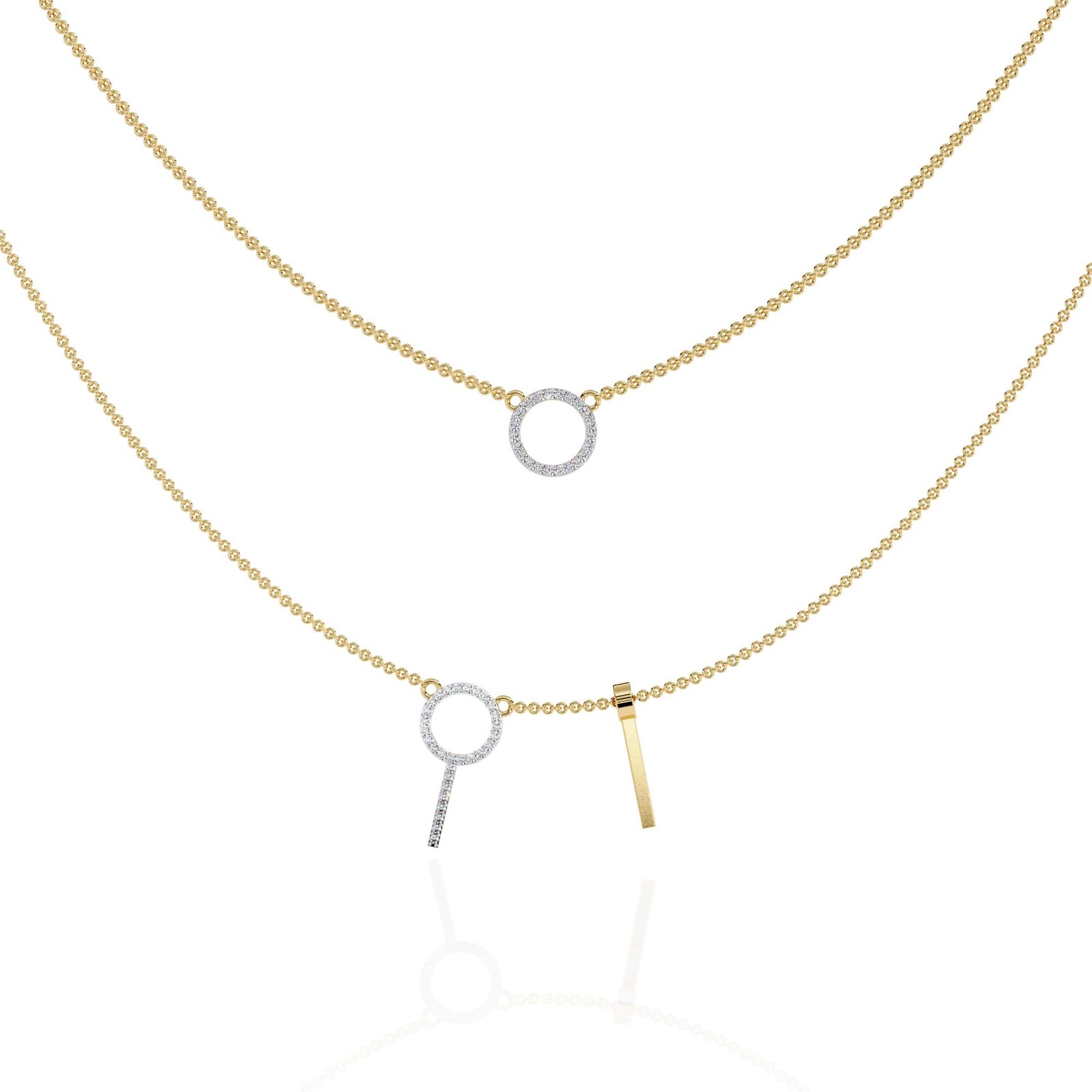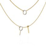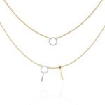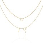 “The necklaces share a minimalist aesthetic, focusing on clean lines and subtle sparkle.necklaces are styled to be worn together, creating a layered look. The shorter necklace features a simple circle pendant, while the longer necklace has a more unique, elongated pendant.”