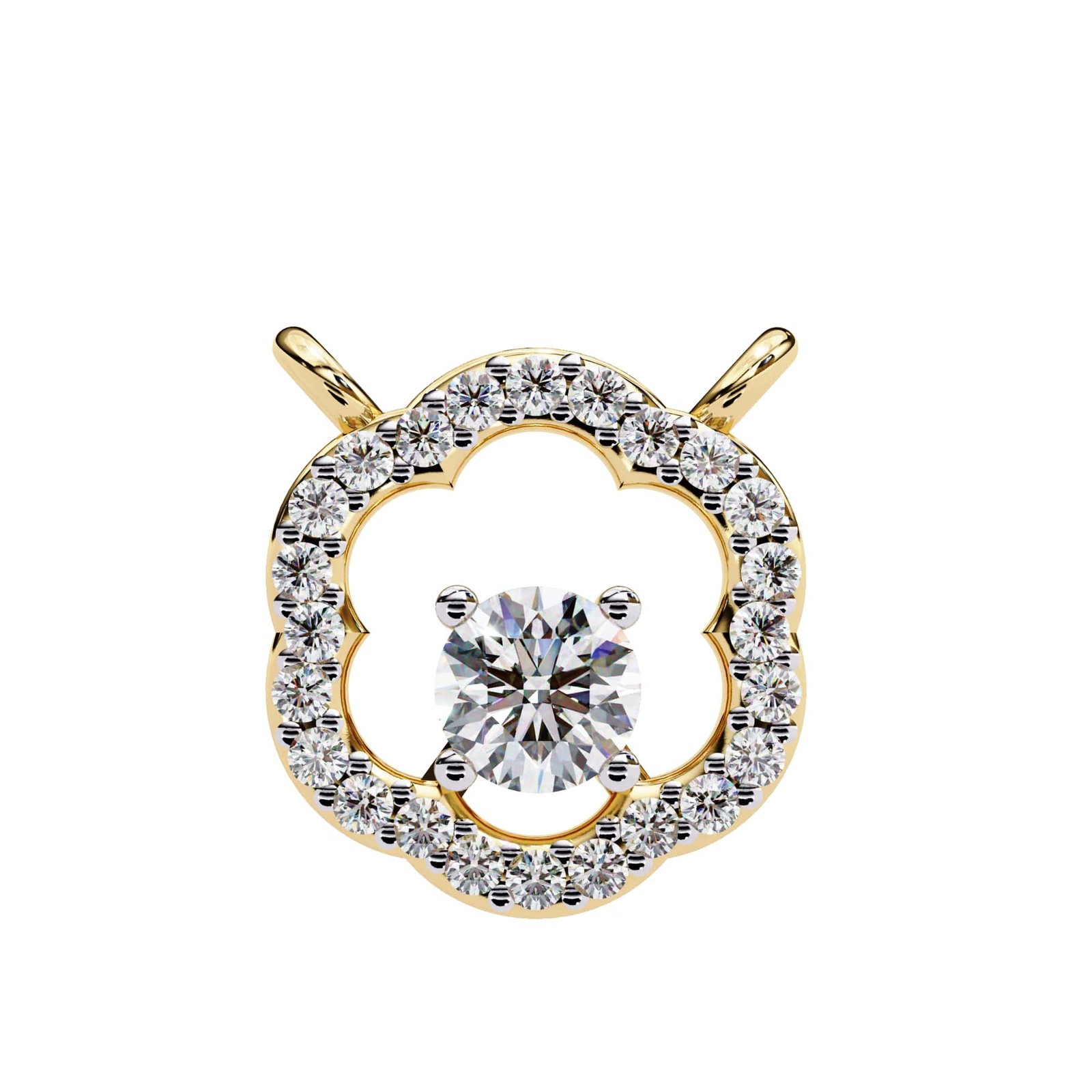 The round brilliant cut is celebrated for its ability to maximize light reflection, creating a dazzling sparkle that captivates the eye.Surrounding the center diamond is a delicate and intricately designed floral halo. This halo is composed of smaller diamonds, meticulously pave-set to create the impression of blossoming petals