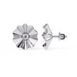 The earrings feature a stylized floral design, resembling a blooming flower or a sunburst. They have a central diamond surrounded by radiating, petal-like structures with a fluted or pleated texture.