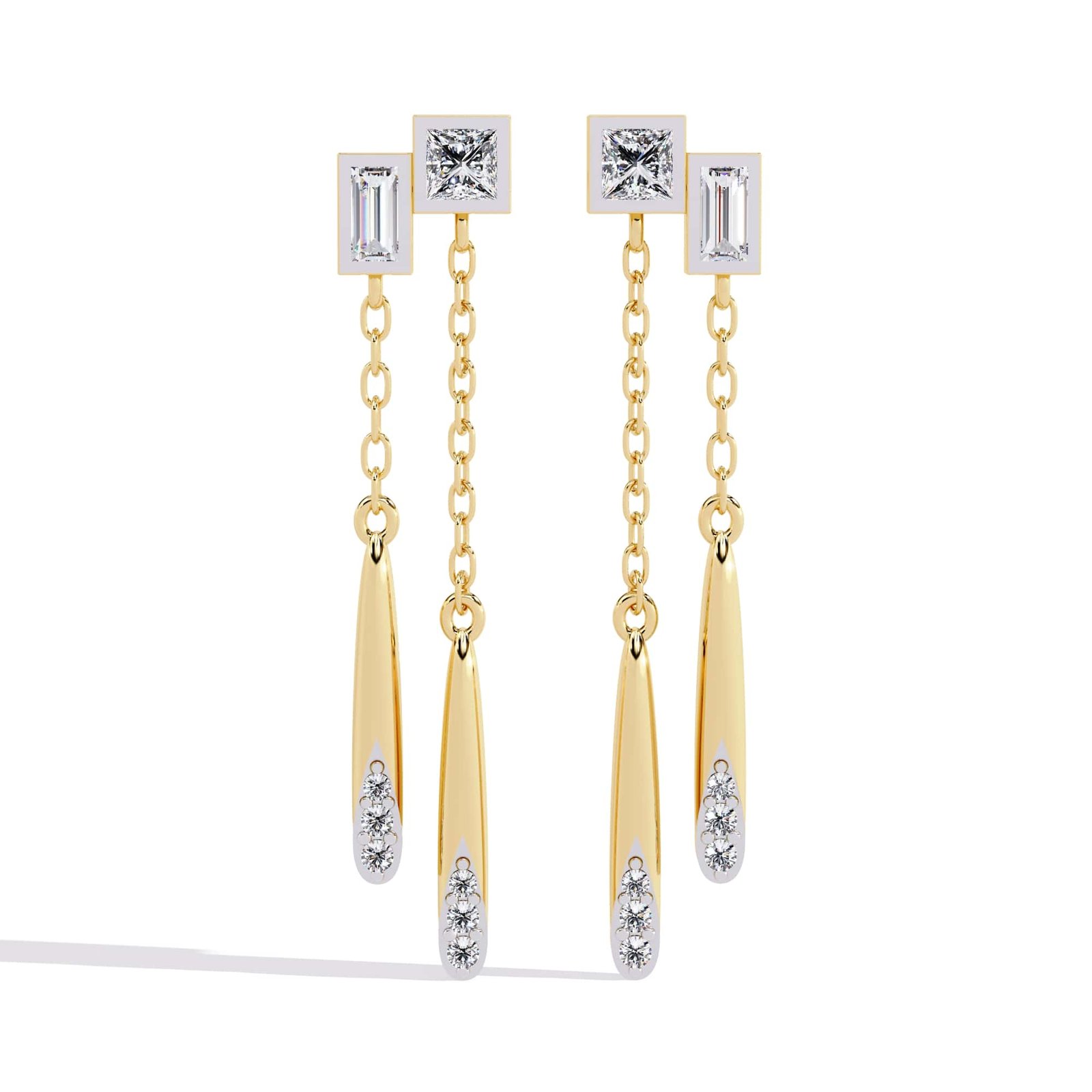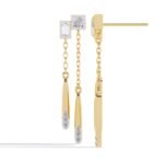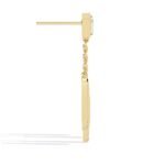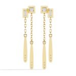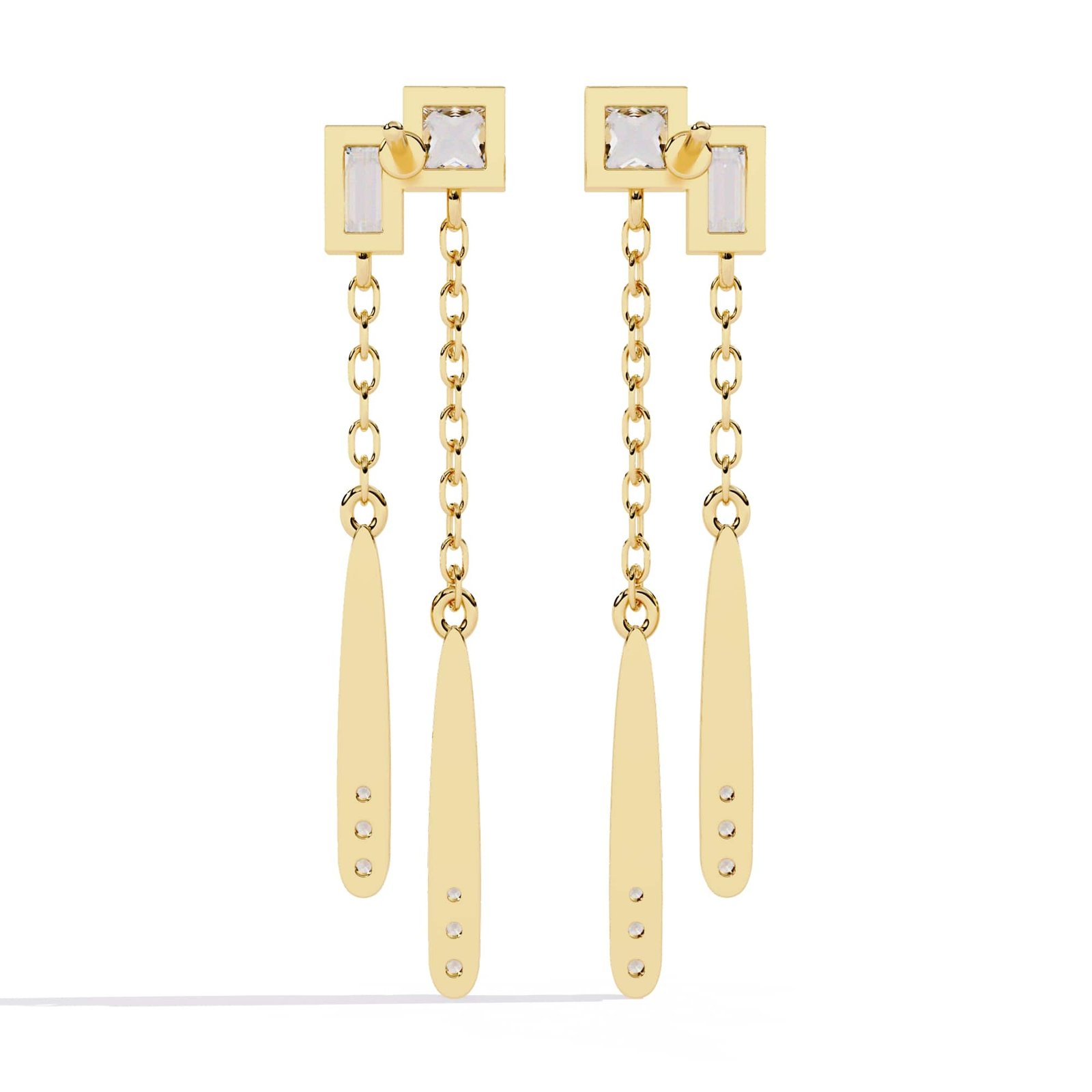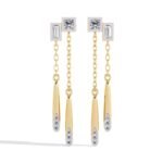 The earrings feature a modern, geometric design with a combination of square, rectangular, and elongated teardrop shapes. They have a linear, dangling structure with a chain connecting the top and bottom elements.