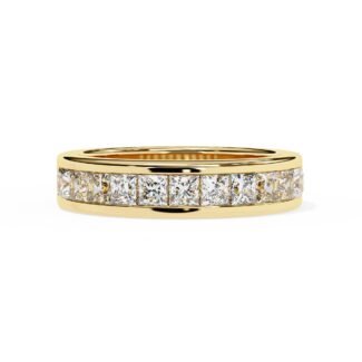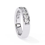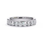 The ring features a continuous row of round brilliant-cut diamonds set in a channel setting. This means the diamonds are nestled between two parallel walls of metal, creating a smooth and secure setting.