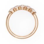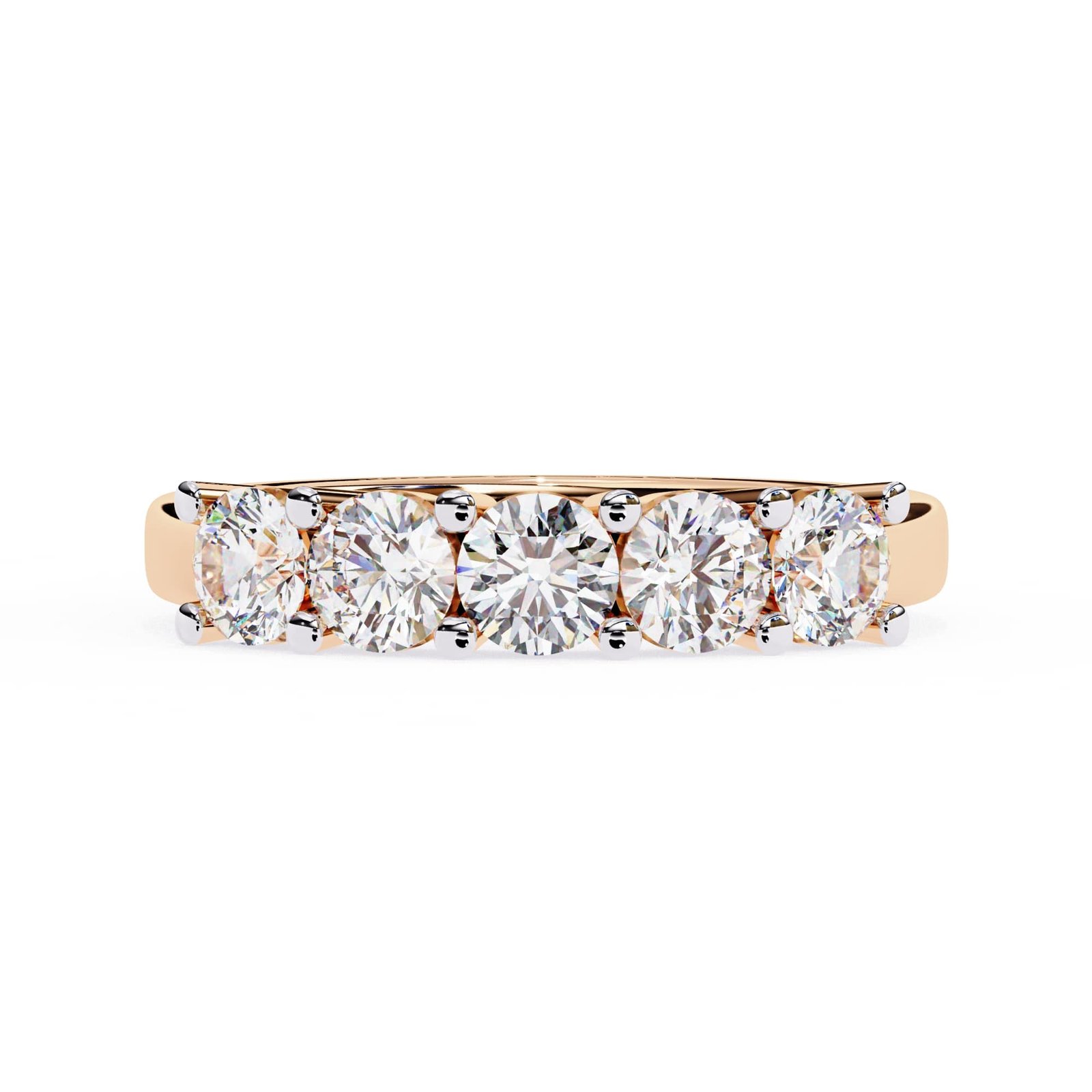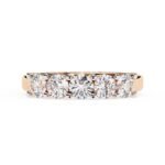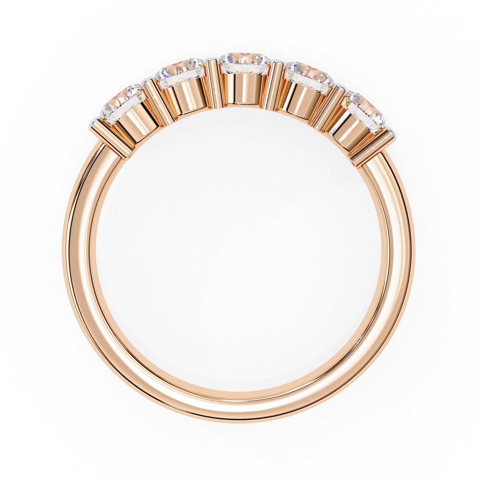 The ring features five round brilliant-cut diamonds set in a row across the top of the band. The ring is shown from a straight-on, eye-level perspective, allowing for a clear view of the diamonds and their setting.