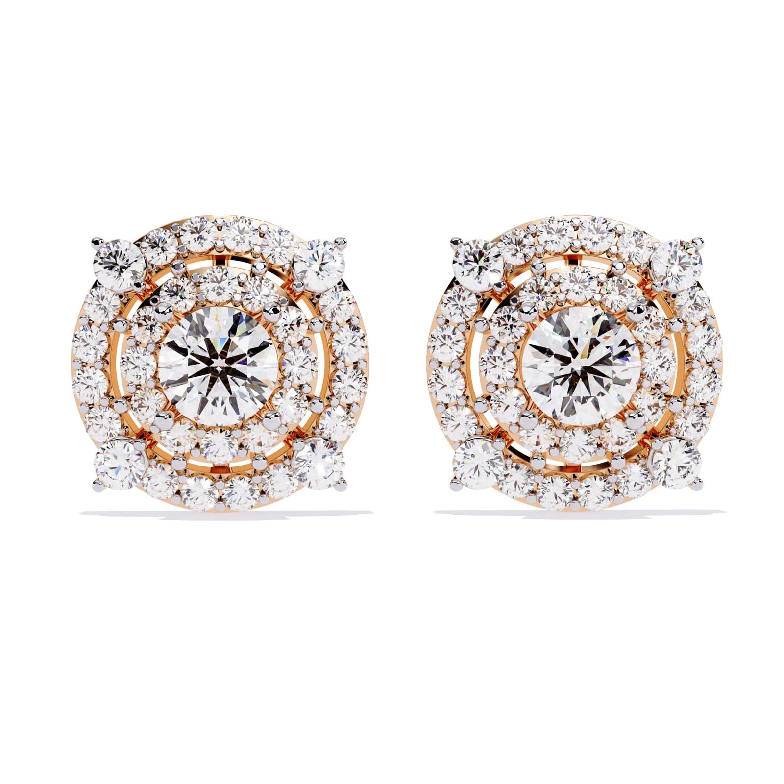 They feature a center round brilliant cut diamond surrounded by two concentric halos of smaller round brilliant cut diamonds.The earrings are stud earrings, designed to sit flush against the earlobe.