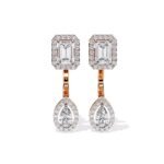 The earrings are drop earrings with a two-part design, featuring a top element and a dangling element.They showcase a classic and timeless aesthetic, combining geometric shapes with sparkling diamonds.