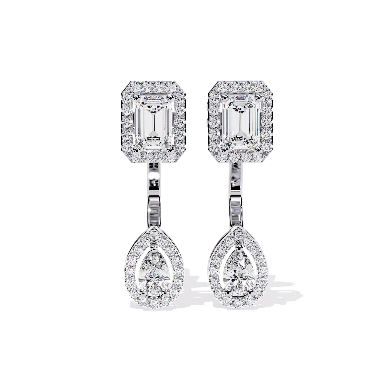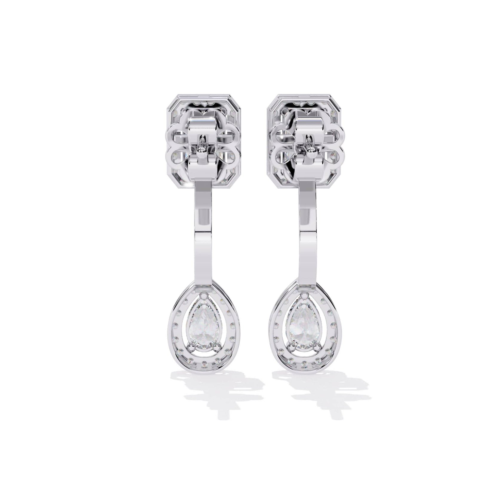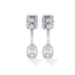 The earrings are drop earrings with a two-part design, featuring a top element and a dangling element.They showcase a classic and timeless aesthetic, combining geometric shapes with sparkling diamonds.