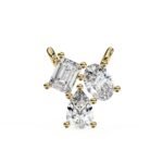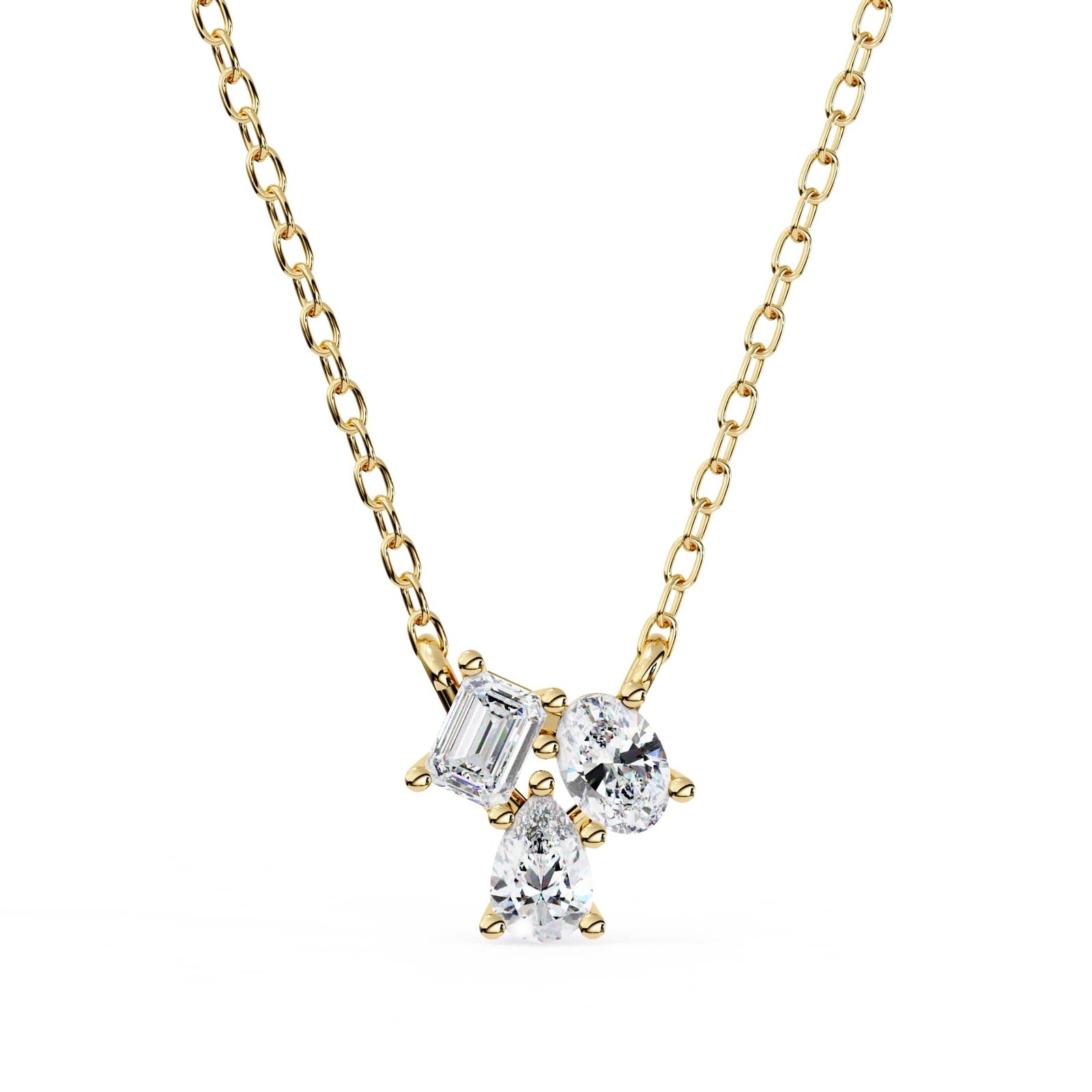 “A cluster pendant featuring three different diamonds, set in a simple prong setting,The combination of different cuts and shapes creates visual interest and makes the pendant a statement piece. The cluster setting keeps the stones close together for maximum impact”