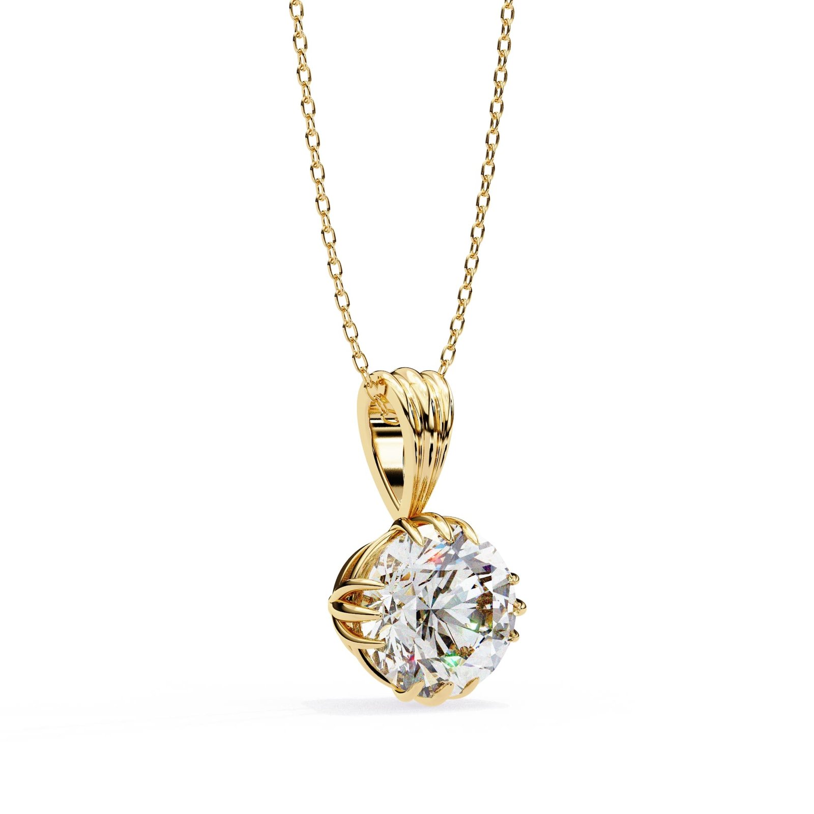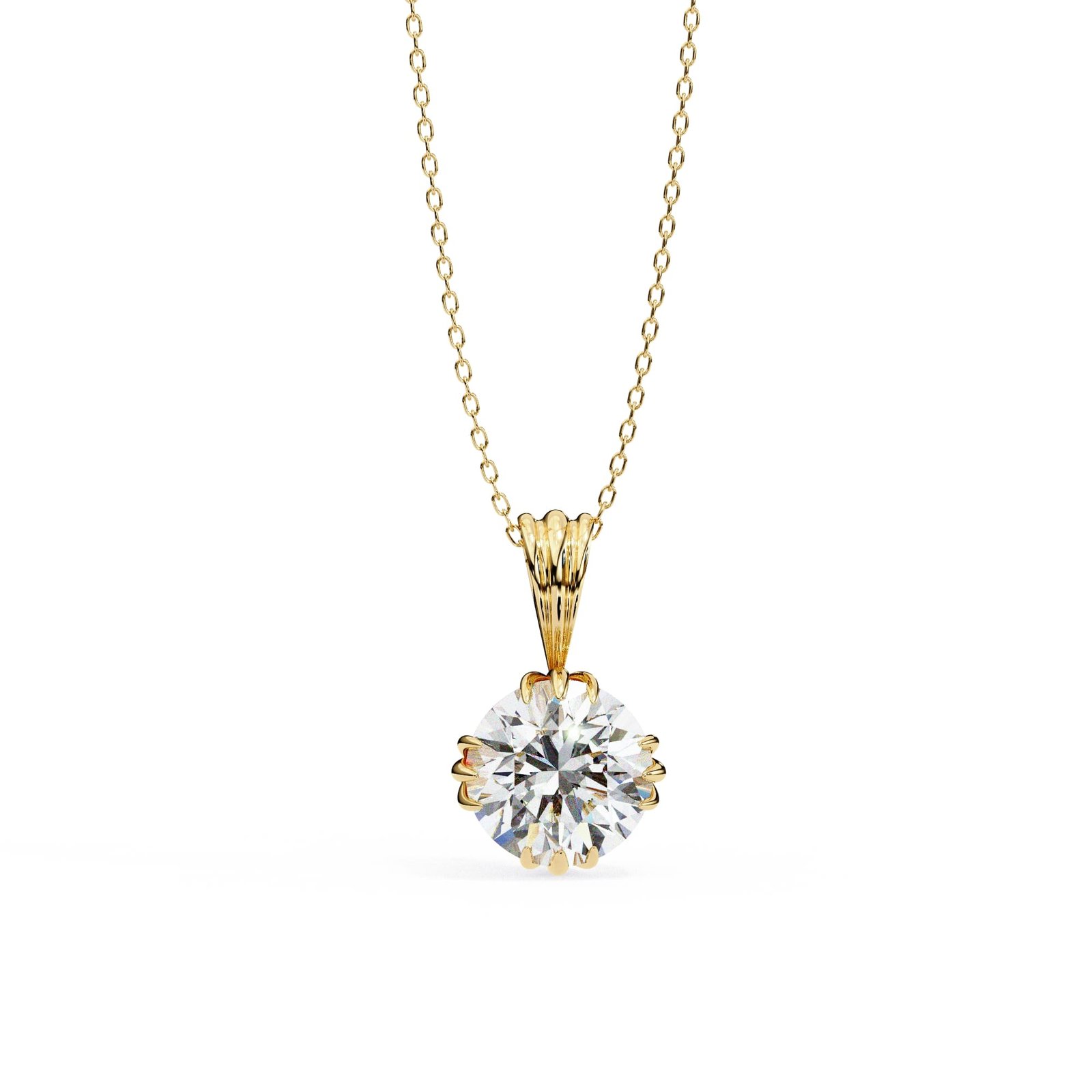 The design is classic with a touch of vintage flair – a beautiful round-cut diamond set in a decorative gold setting. The ornate details of the setting and bail elevate the design beyond a simple solitaire pendant.