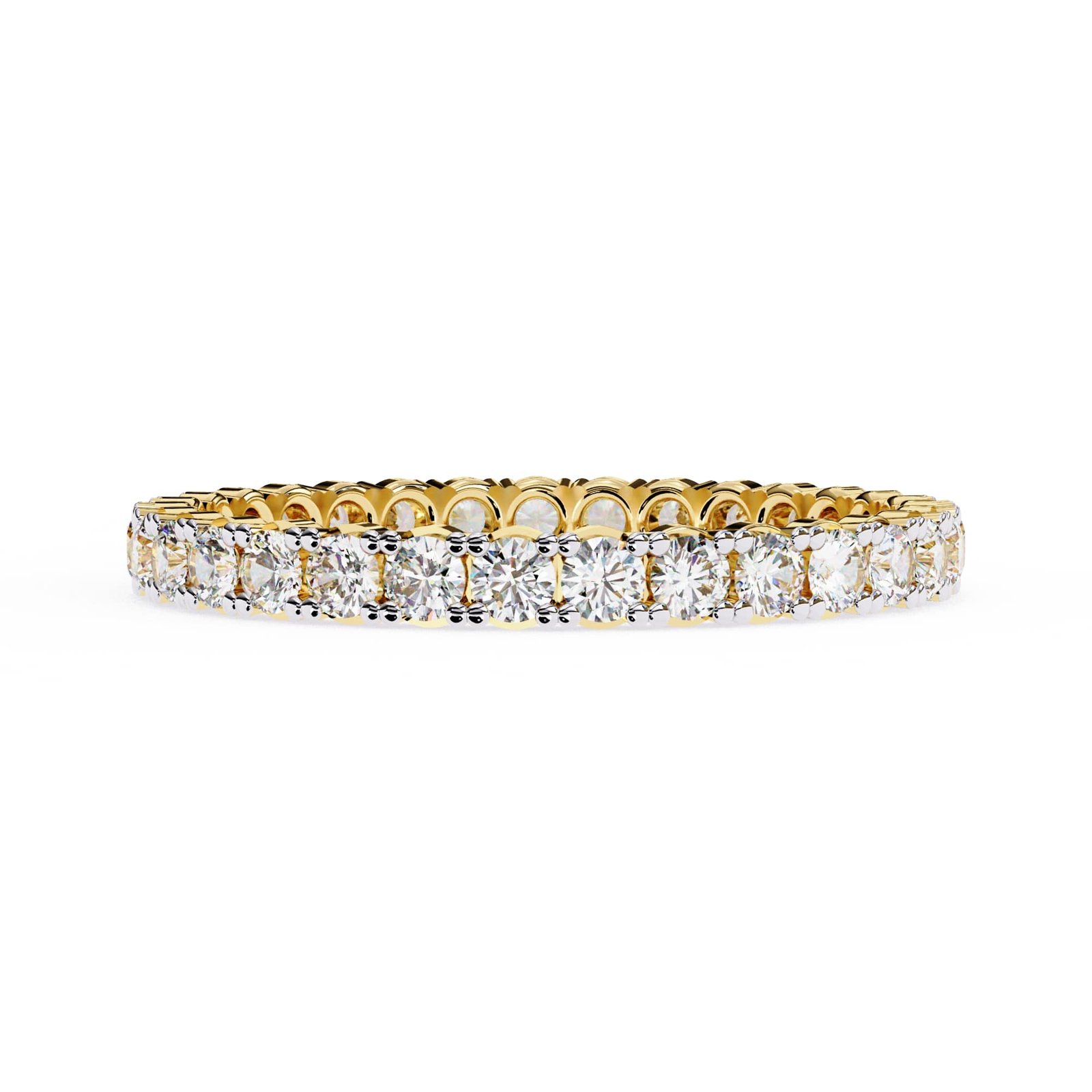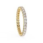 The ring features a continuous circle of round brilliant-cut diamonds, creating an “eternity” design. This symbolizes everlasting love or commitment, as the circle has no beginning or end.