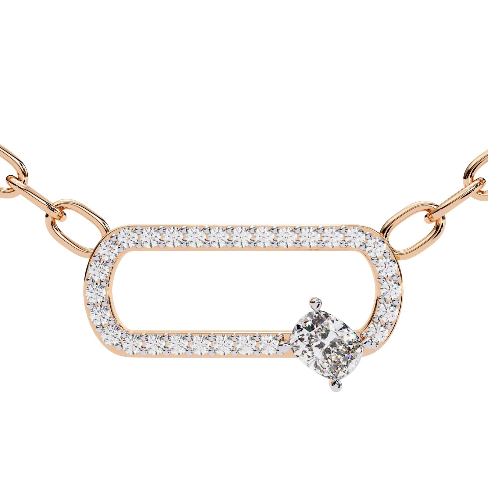 A pendant necklace featuring a unique, elongated, rounded rectangle pendant, encrusted with small diamonds or diamond simulants, and accented by a larger, bezel-set diamond or diamond simulant.