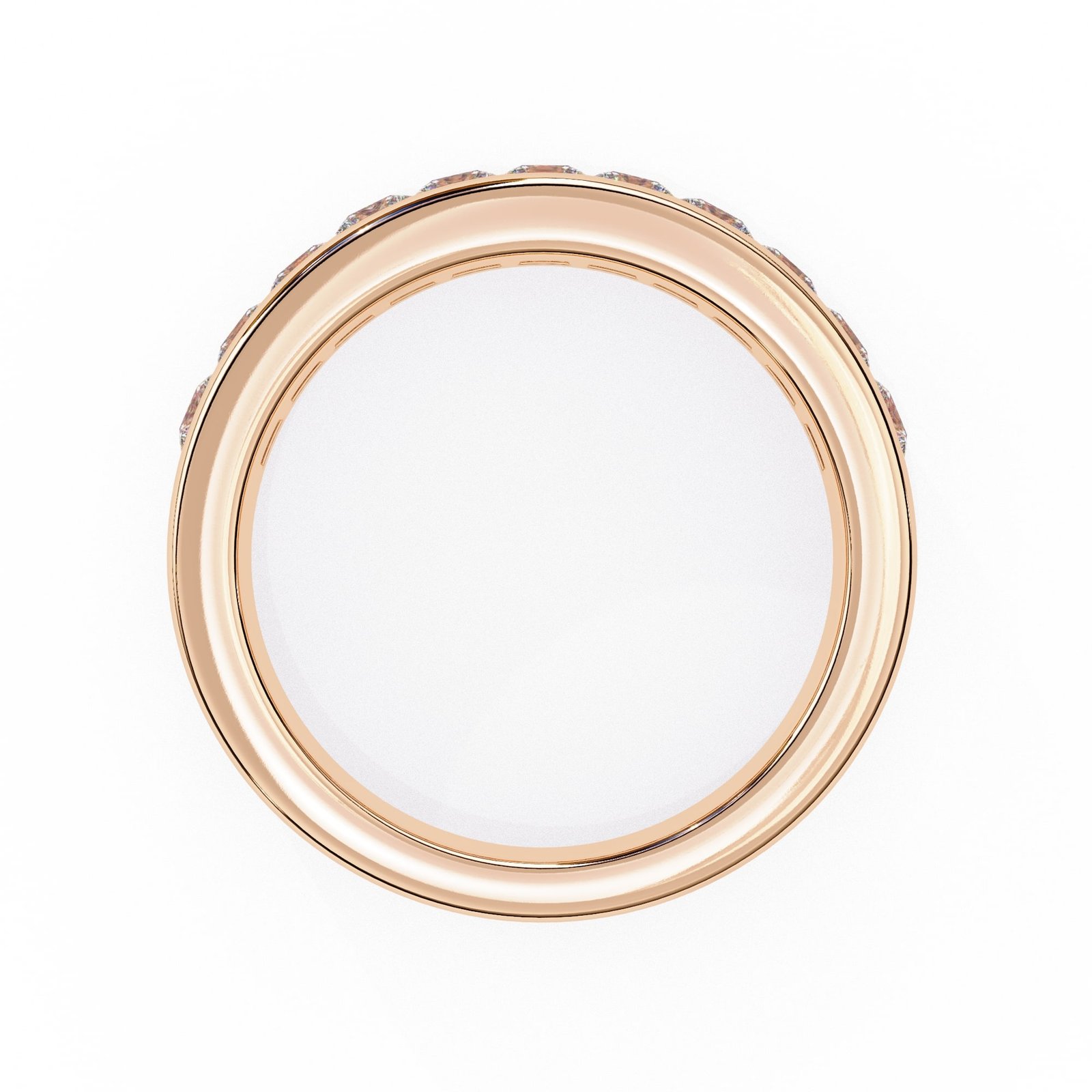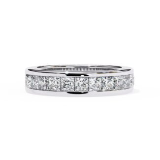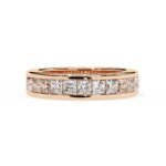 The ring features a continuous row of round brilliant-cut diamonds set in a channel setting. This means the diamonds are nestled between two parallel walls of metal, creating a smooth and secure setting.