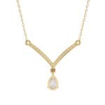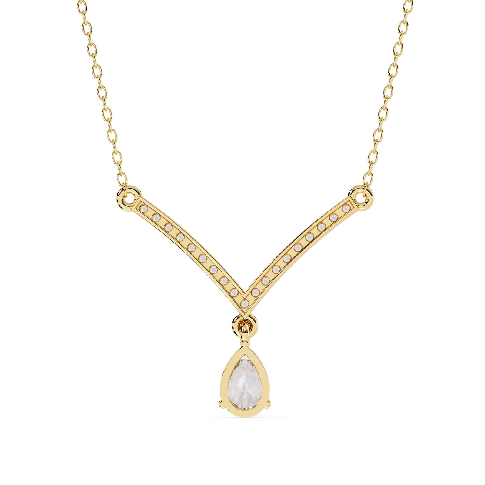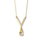 The necklace features a classic V-shape design, with the pendant portion forming the point of the V. This style is known for its elongating and flattering effect on the neckline.The pear-shaped diamond appears to be prong-set, allowing maximum light to reach the stone.
