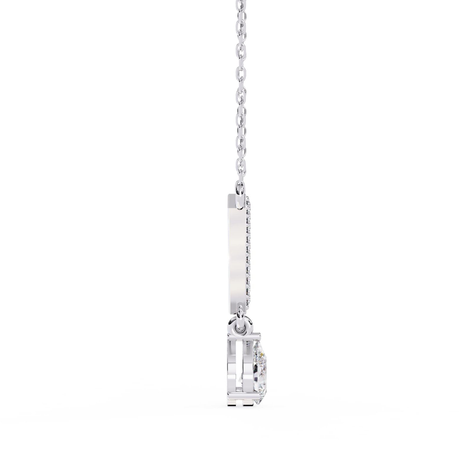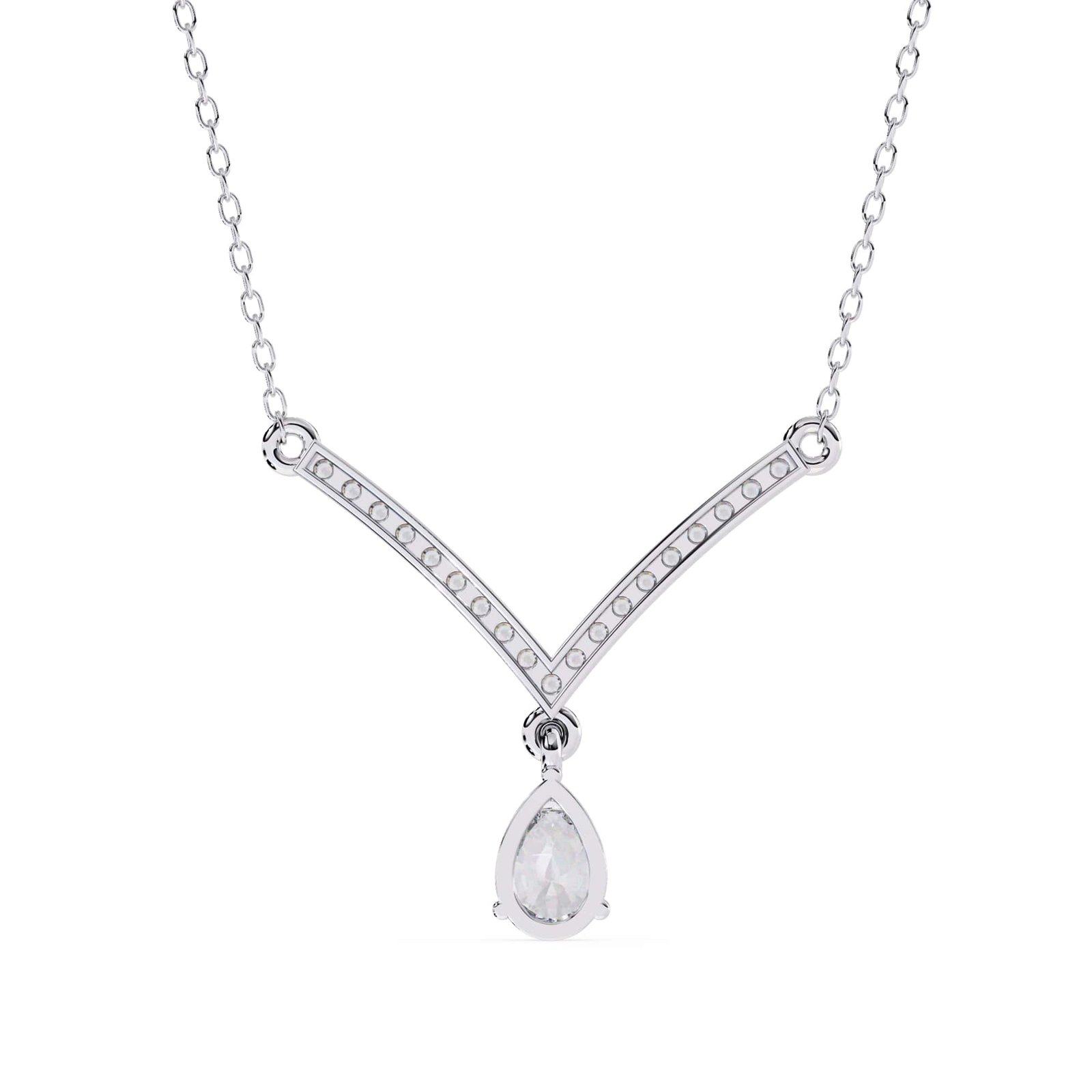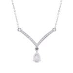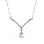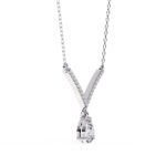 The necklace features a classic V-shape design, with the pendant portion forming the point of the V. This style is known for its elongating and flattering effect on the neckline.The pear-shaped diamond appears to be prong-set, allowing maximum light to reach the stone.