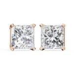 The earrings feature princess-cut diamonds, which are square-shaped with sharp, clean corners. The diamonds appear to be of good quality, exhibiting brilliance and sparkle. The facet patterns are clearly visible, indicating a well-executed cut.The prongs are substantial and appear to be part of a squared, basket-like setting that adds to the overall geometric aesthetic of the earrings.